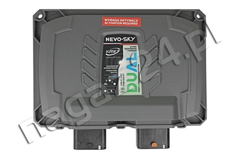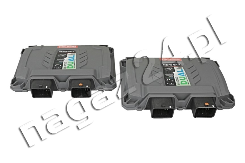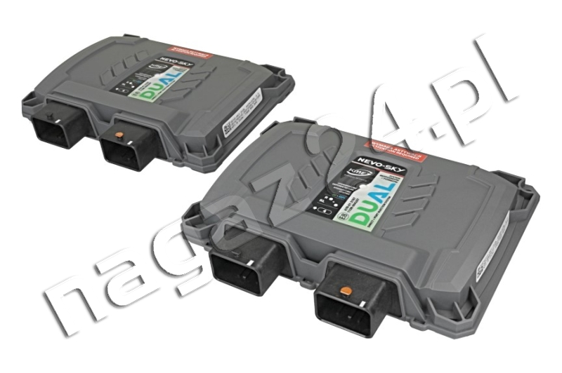 Centrala, sterownik KME NEVO-SKY DUAL 6-8 CYL. DIRECT (DI + MPI) R/RL – 2 sterowniki systemu KME NEVO-SKY DUAL łódzkiej firmy KME wchodzące w skład samochodowych instalacji gazowych IV generacji (sekwencyjnych wtrysków gazu w fazie lotnej z udziałem benzyny) znajdujących zastosowanie w konwersji na zasilanie LPG 6- i 8-cylindrowych silników z dualnym, podwójnym (bezpośrednim i pośrednim) wtryskiem benzyny. W tego rodzaju silnikach w każdej komorze spalania znajduje się wtryskiwacz benzynowy a w kanale dolotowym każdego z cylindrów pracuje jeszcze wtryskiwacz realizujący pośredni wtrysk benzyny.