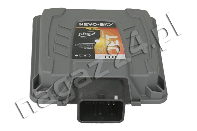 KME NEVO-SKY JET ECO 4 cylindry elektronika DG7 5,5 bar RL – uniwersalny zestaw montażowy elektroniki samochodowej instalacji gazowej IV generacji (sekwencyjnego wtrysku LPG w fazie lotnej) NEVO-SKY JET ECO w wersji RL firmy KME, przeznaczony do konwersji na zasilanie LPG samochodów wyposażonych w 3- i 4-cylindrowe jednostki napędowe z pośrednim wtryskiem benzyny.