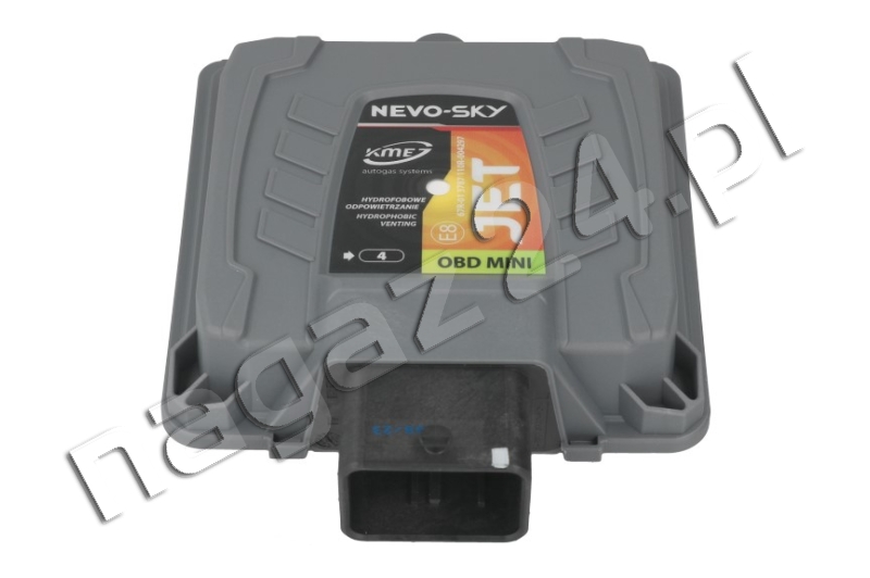 KME NEVO-SKY JET OBD MINI 4 cylindry elektronika DG7 5,5 bar – uniwersalny zestaw montażowy elektroniki samochodowej instalacji gazowej IV generacji (sekwencyjnego wtrysku LPG w fazie lotnej) NEVO-SKY JET OBD MINI firmy KME, przeznaczony do konwersji na zasilanie LPG samochodów wyposażonych w 3- i 4-cylindrowe jednostki napędowe z pośrednim wtryskiem benzyny. Sterownik NEVO-SKY JET OBD MINI ma możliwość współpracy z układem OBD samochodu.