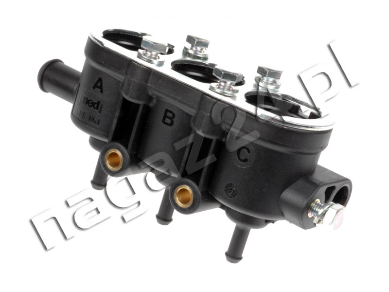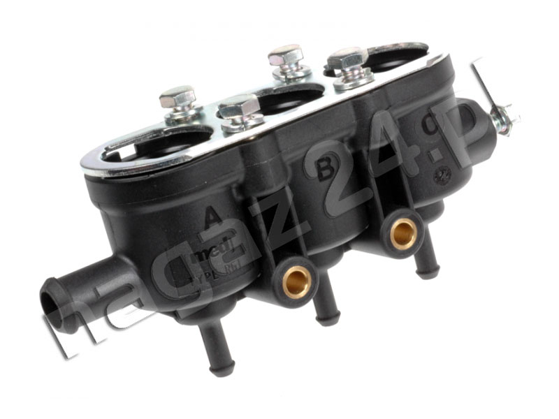 Korpus, obudowa listwy wtryskiwaczy gazowych MED RGI plastikowa 3 cylindry pod czujnik – obudowa listwy wtryskiwaczy gazowych jest częścią zamienną do 3-sekcyjnej listwy wtryskowej MED, znajdującej zastosowanie w samochodowych instalacjach gazowych IV generacji (sekwencyjnych wtryskach gazu w fazie lotnej) firmy Landi Renzo. Takie listwy (3-sekcyjne) mogą być stosowane do konwersji na zasilanie LPG np. w samochodach z silnikami 3- i 6-cylindrowymi.