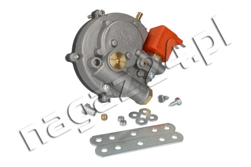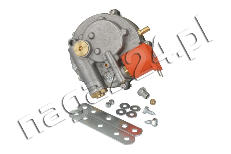 W komplecie: Reduktor AT10 moto z zintegrowanym filtrem (E8-67R-01 4684) średnica króćca wyjścia gazu 7 milimetrów - 1 szt., Płaskownik do mocowania (10 cm x 1,5 cm, pieć otworów pod śrubę M6) - 1 szt., Podkładka szerokokołnierzowa (M5) - 2 szt., Nakrętka (M5) - 2 szt., Blachowkręt pod klucz "10" - 2 szt., Śruba uszczelniająca do przewodu Cu fi6 - 1 szt., Baryłka Cu fi6 - 1 szt.